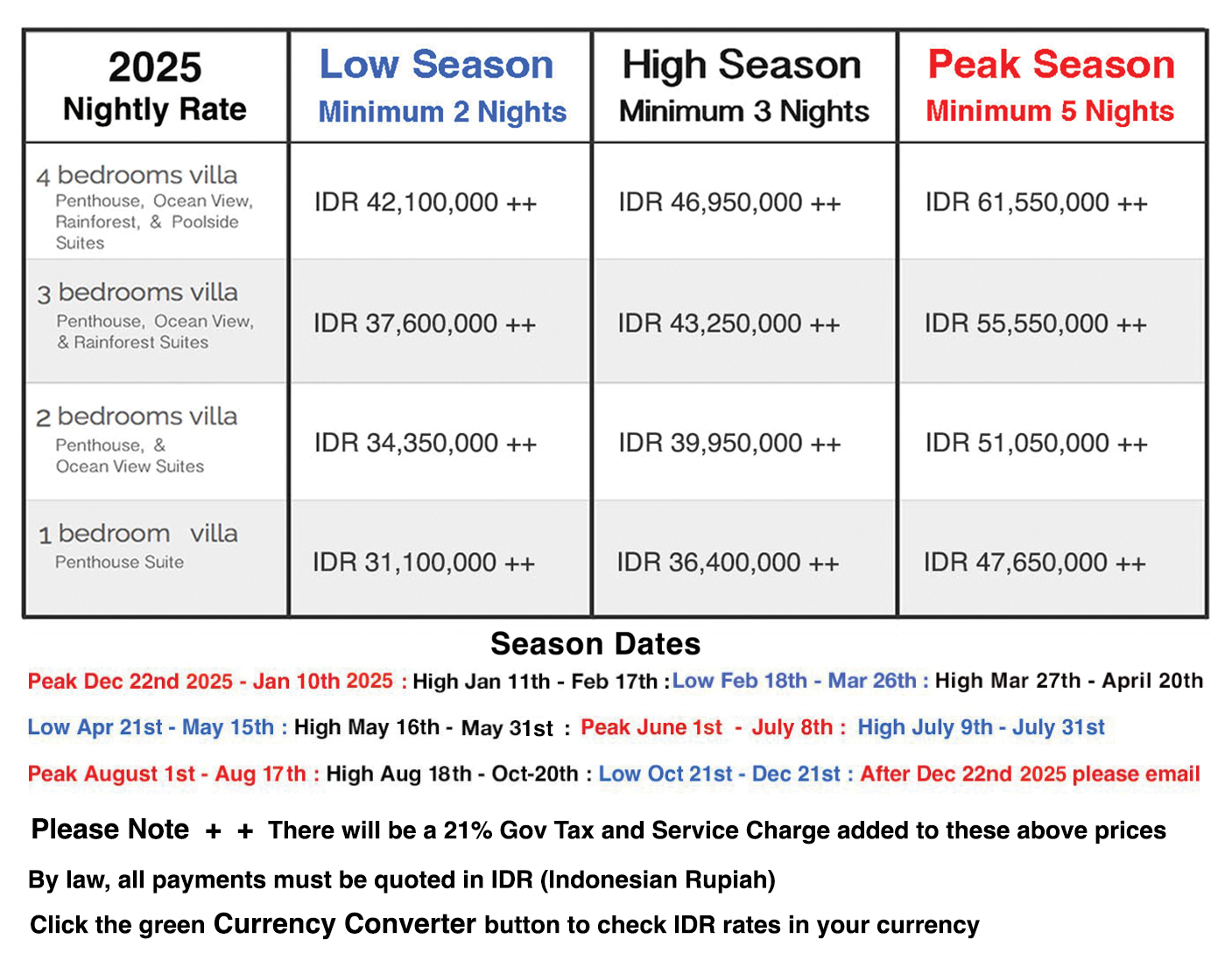 To confirm a Booking the GUEST must make a Booking Deposit to THE LUXE BALI within 7 working days of the Booking Invoice issue date, either directly or through your travel AGENT. If the below booking deposit payments are not received in time, THE LUXE BALI will void the booking request.