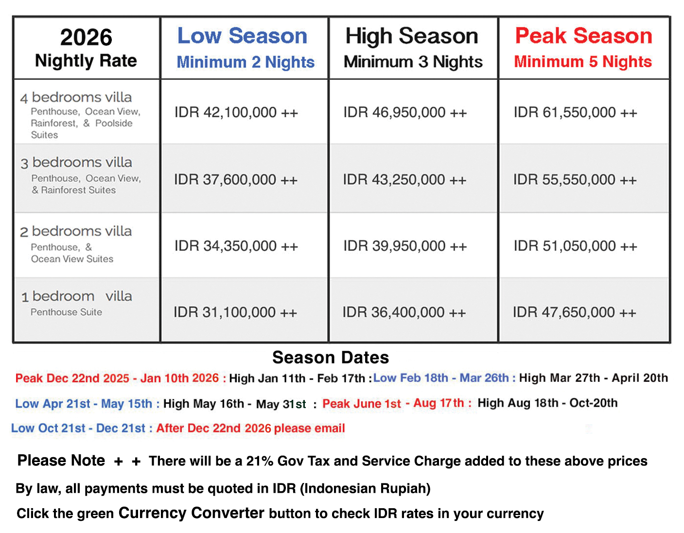 All payment will be processed in Indonesia Rupiah (IDR) for bookings made outside Indonesia, You can check what the value will be in your regular currency by looking at this link https://www.oanda.com/currency-converter/en